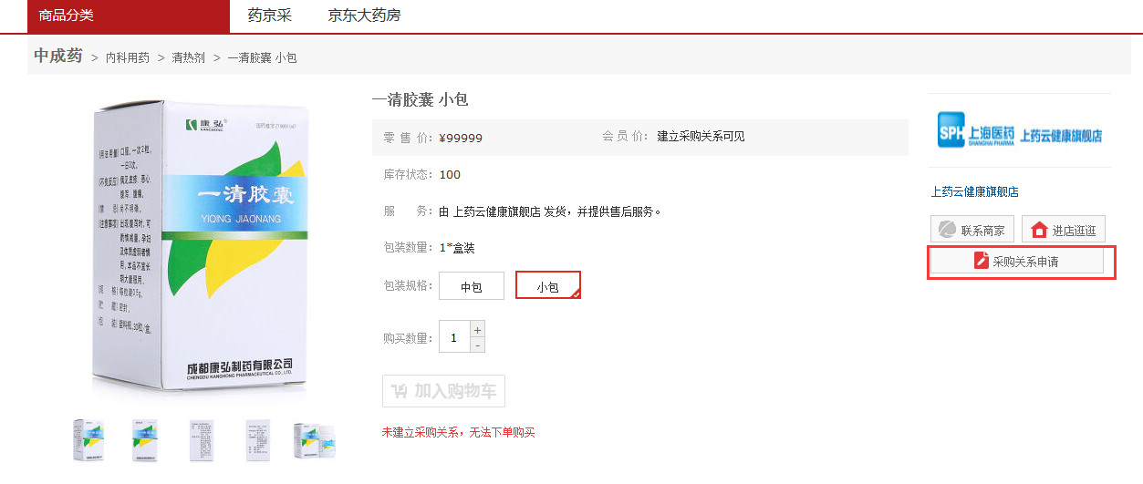 欢迎您在京东医药B2B平台下单采购商品,京东医药平台设定了:卖家只能从已经建立采购关系的商家下单采购商品。下单前,请与商家建立采购关系。