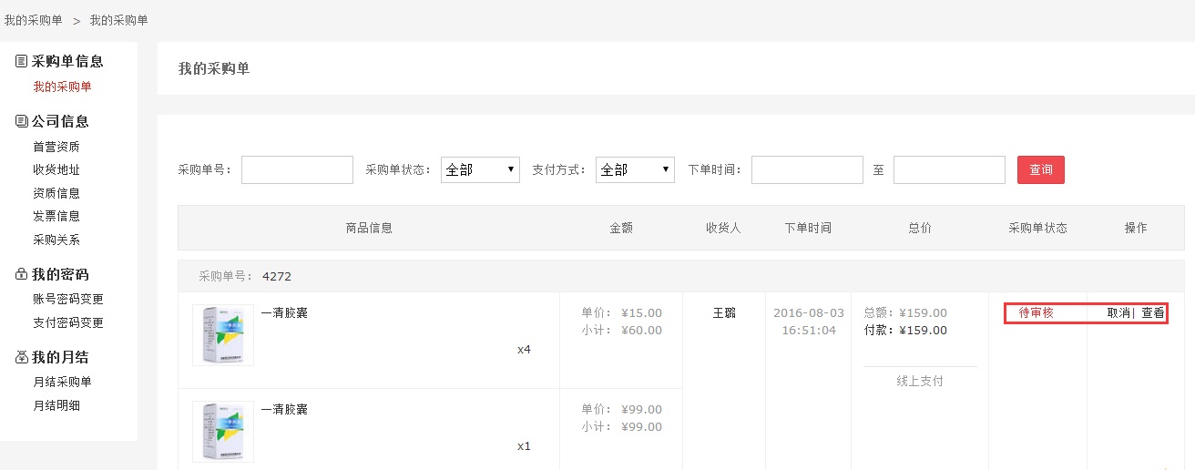 第五步:商家审核采购单,在“我的采购单”页面,可查看采购单的审核状态;