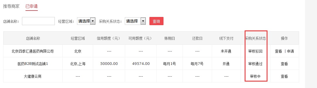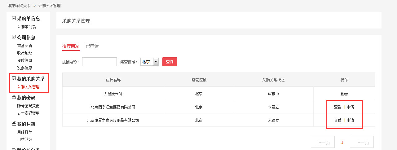2、在我的采购关系管理页面进行申请,选择相应经营区域,即可显示在该区域内经营的所有商家,点击右侧“查看”,可查看该商家基本信息;点击“申请”,即可提交采购关系建立申请,等待商家审核。商家审核成功后,采购关系建立成功。