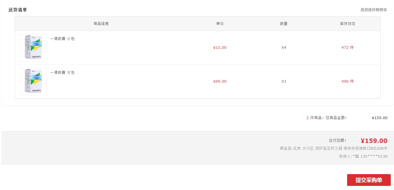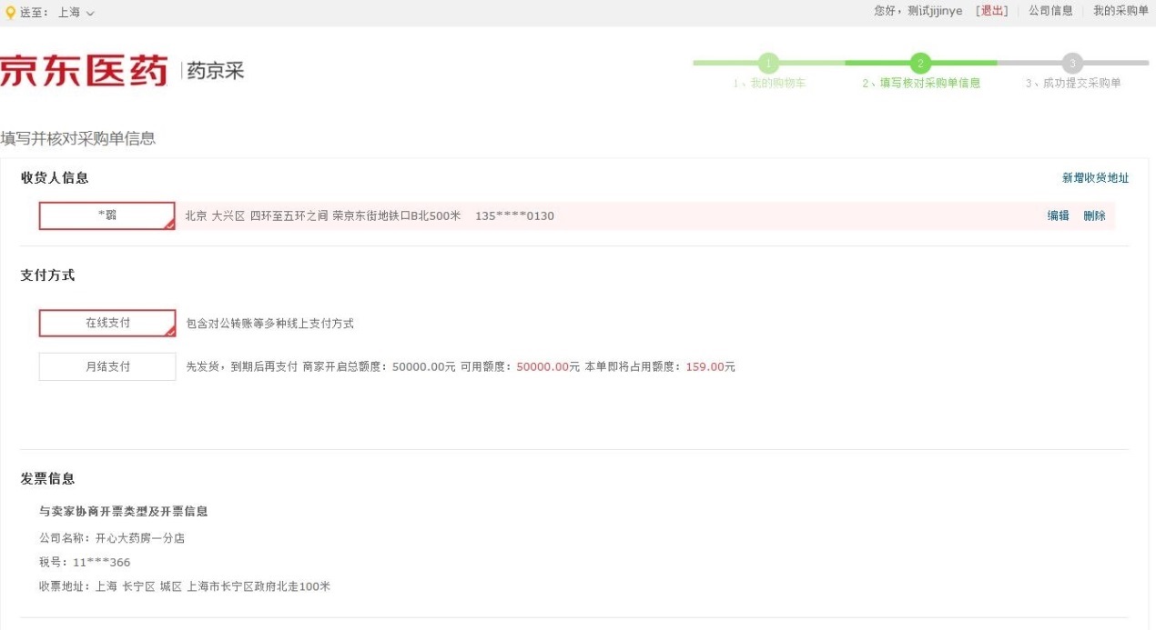 第四步:在采购单页面,需选择收货人、支付方式并再次核对采购信息,均无误后,可提交采购单,采购单提交后需等待商家审核;